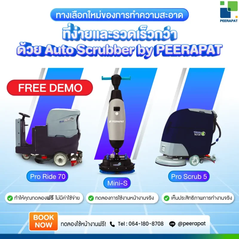 Peerapat เปิดโอกาสให้ธุรกิจและองค์กรที่ต้องการยกระดับมาตรฐานความสะอาด ได้สัมผัสกับนวัตกรรมการทำความสะอาดพื้นรูปแบบใหม่ ผ่านบริการ ทดลองใช้งานฟรี (Free Demo) เครื่อง Auto Scrubber ที่ช่วยให้การขัดล้างพื้นทำได้ง่าย เร็ว และมีประสิทธิภาพสูงกว่าการทำความสะอาดแบบเดิม